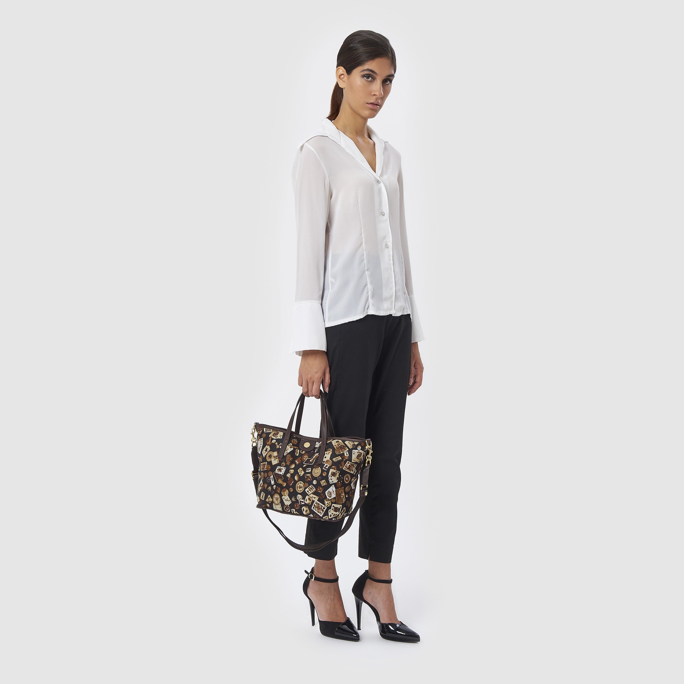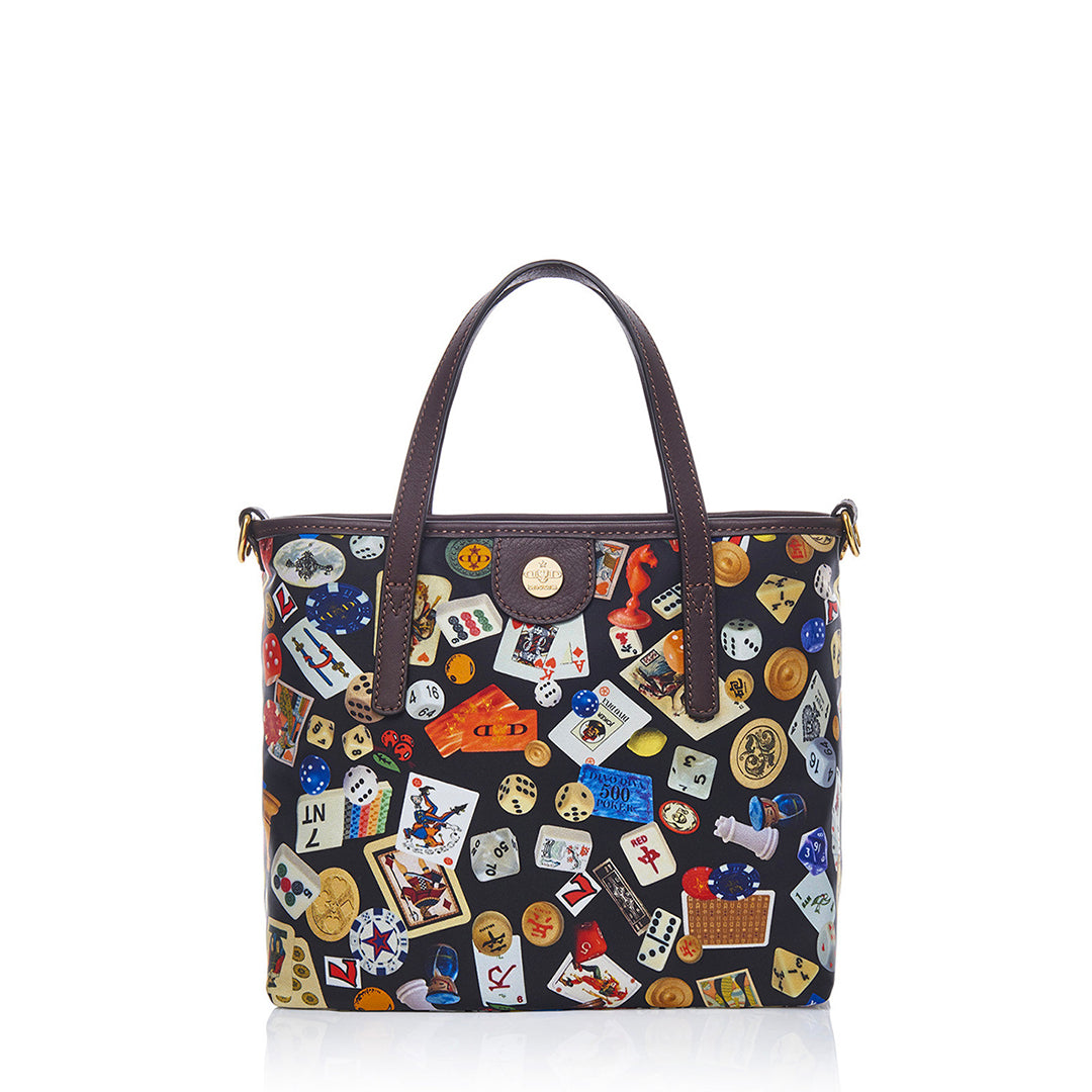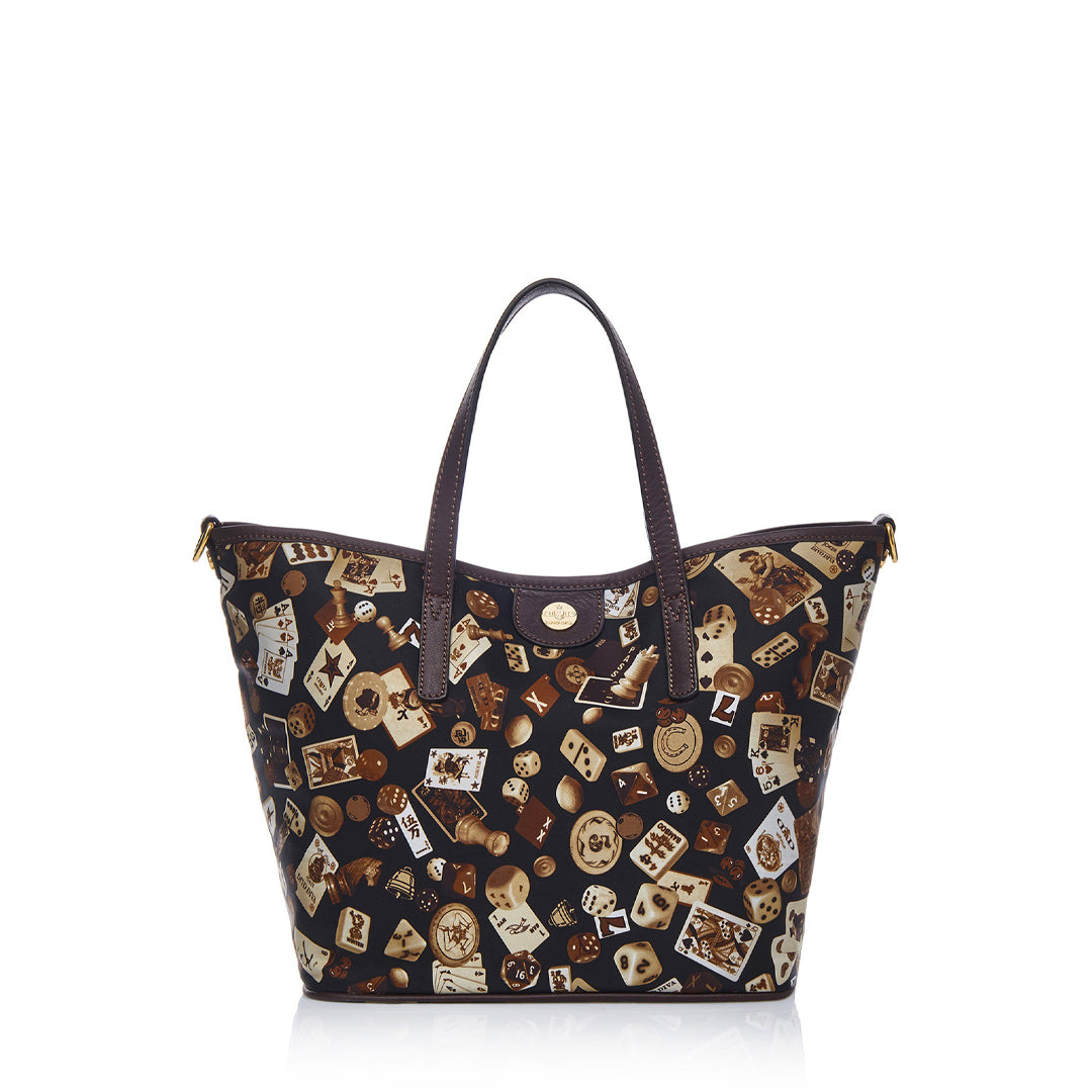 Venice small shopping bag with nylon shoulder strap with multicolor gambling design black/cocoa