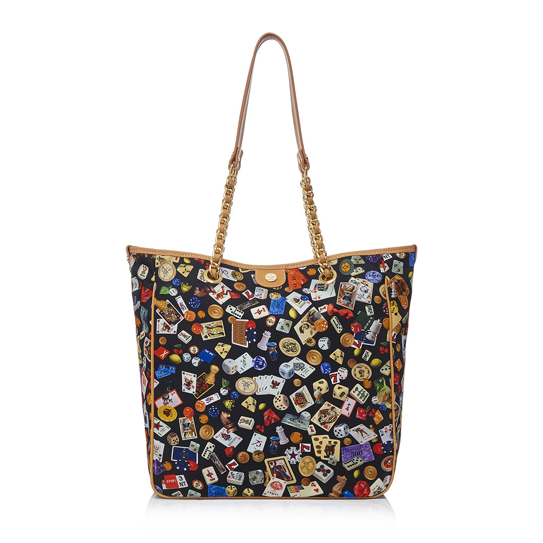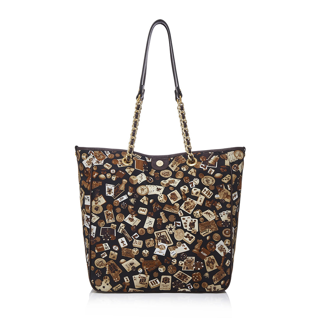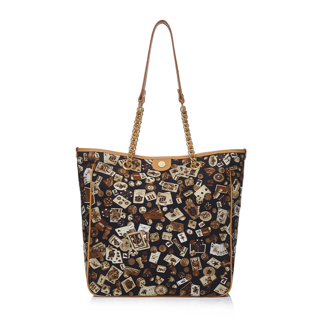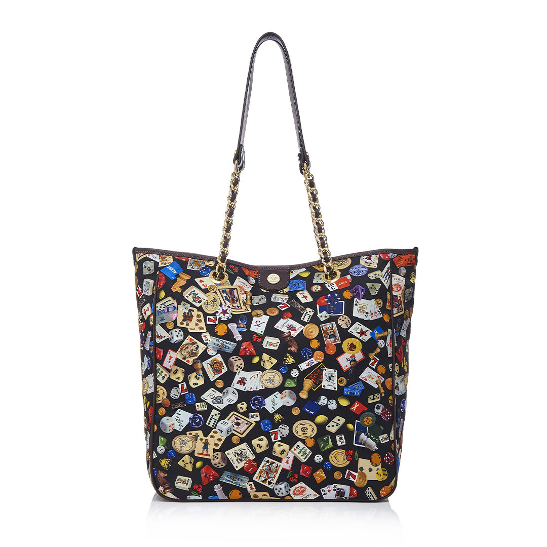 Miami Bolsa shopping bag with nylon chains featuring multicolor gambling design in black/cocoa.