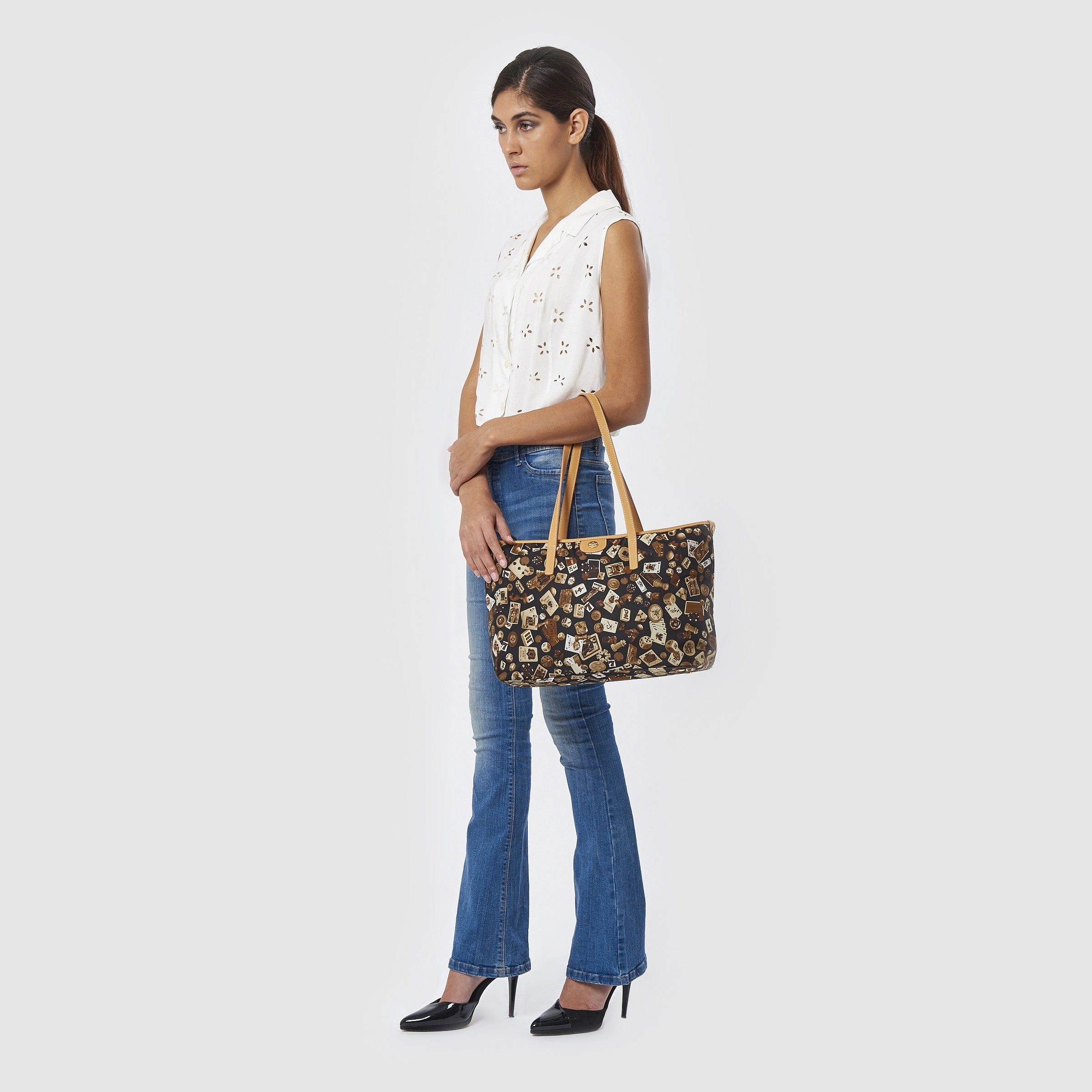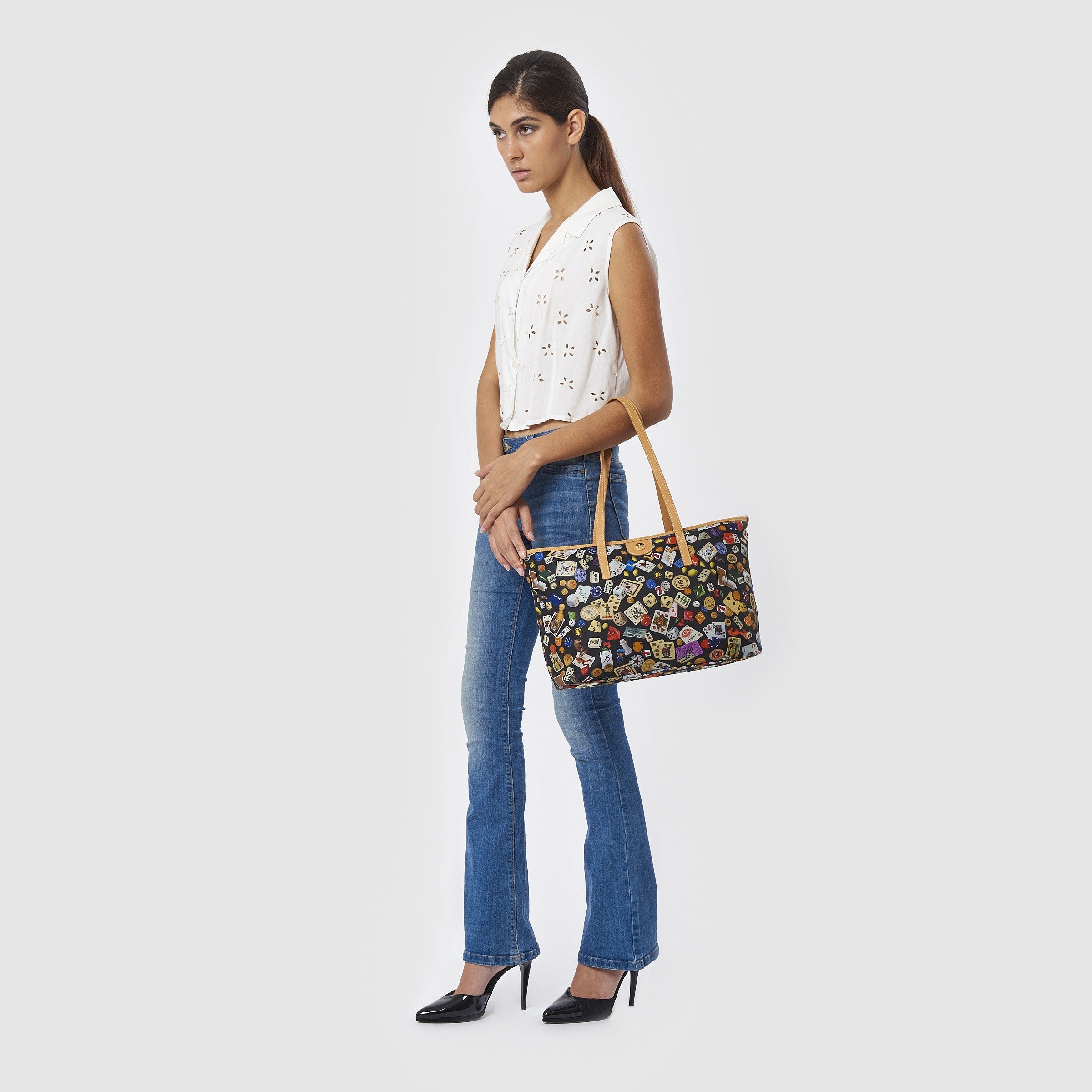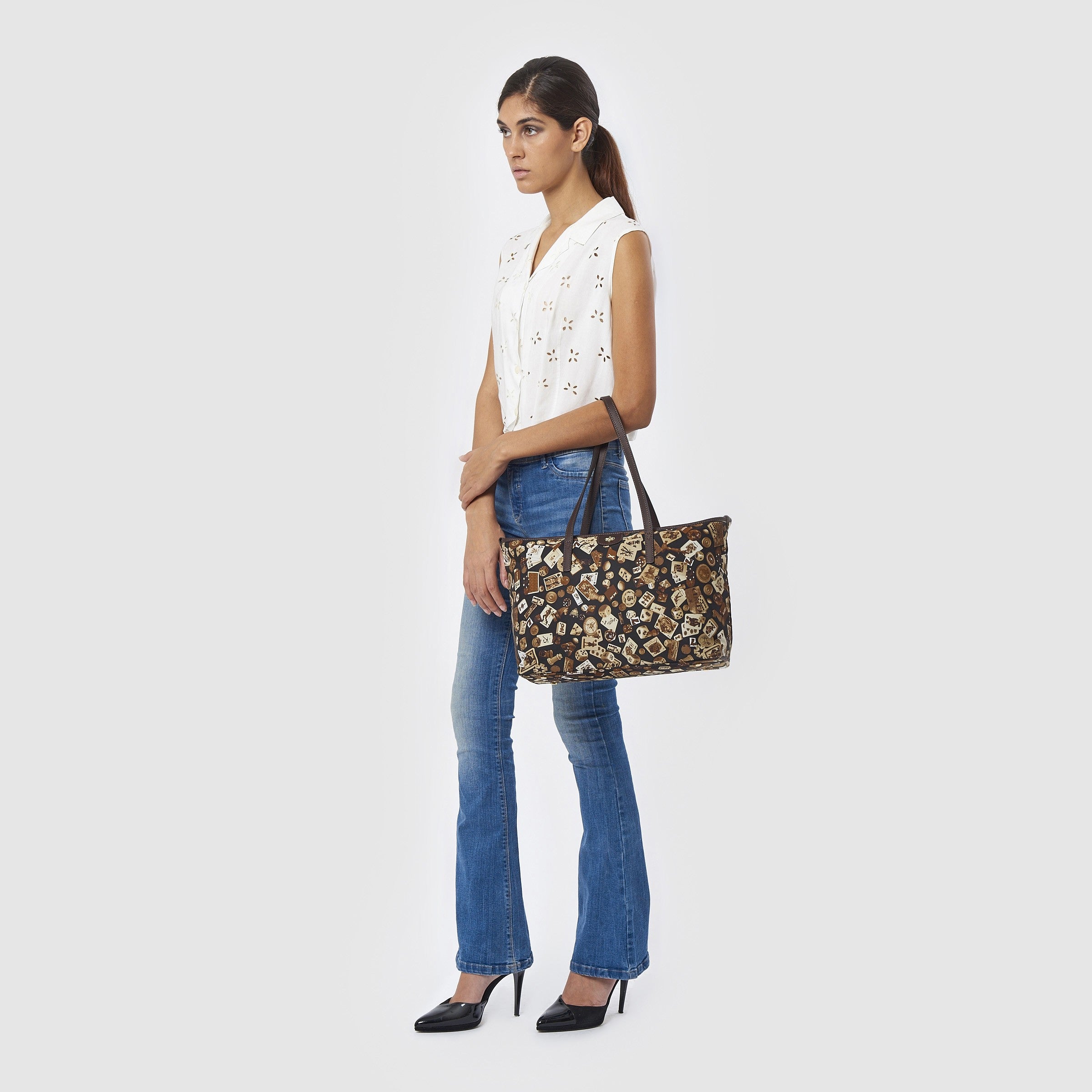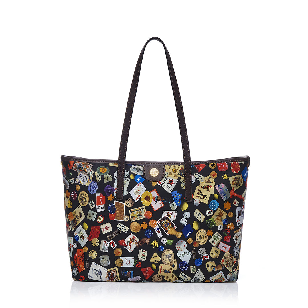 Marbella Borsa shopping media con zip in Nylon con Disegno Gambling Multicolor Nero/Cacao