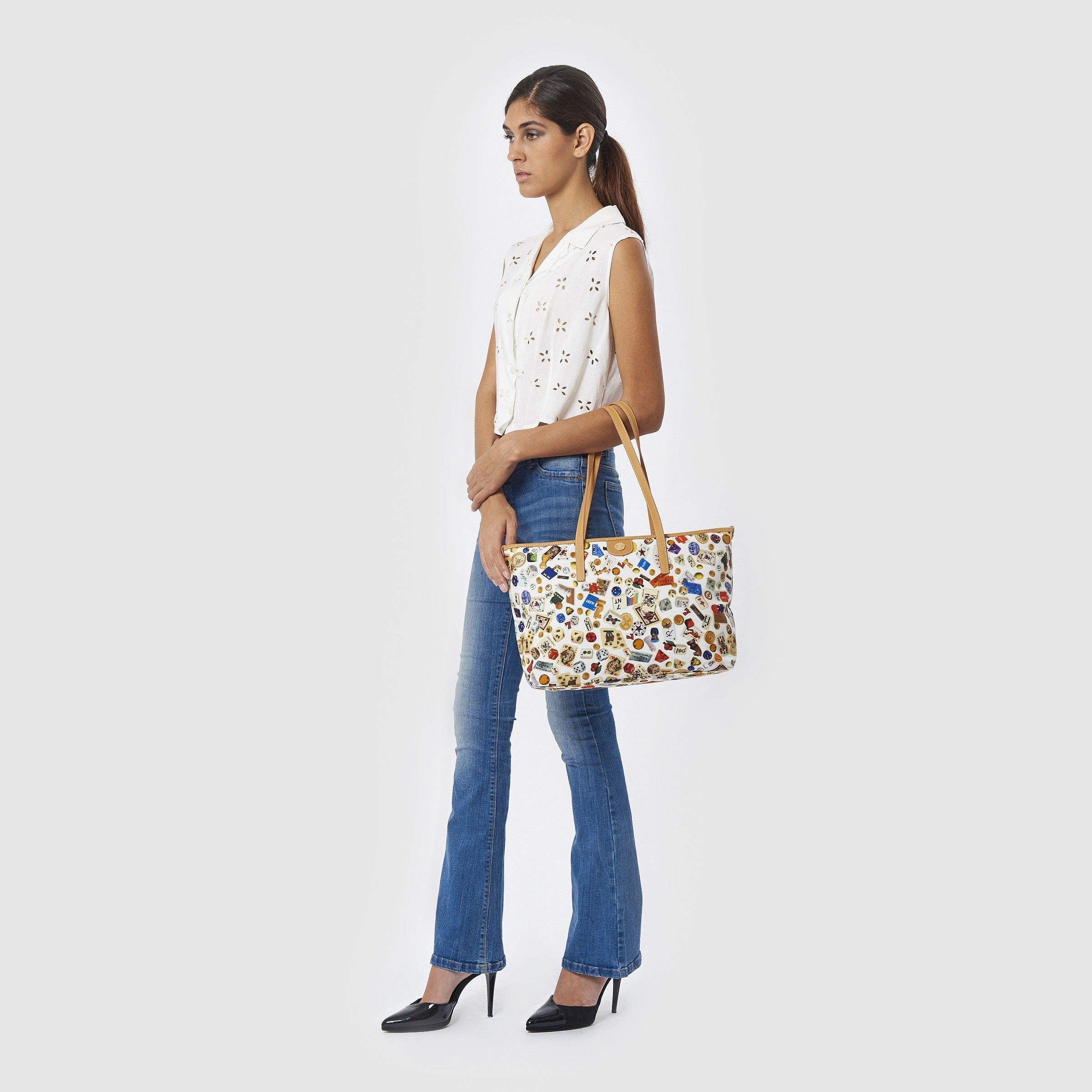 Marbella Borsa shopping media con zip in Nylon con Disegno Gambling Multicolor Bianco/Biscotto